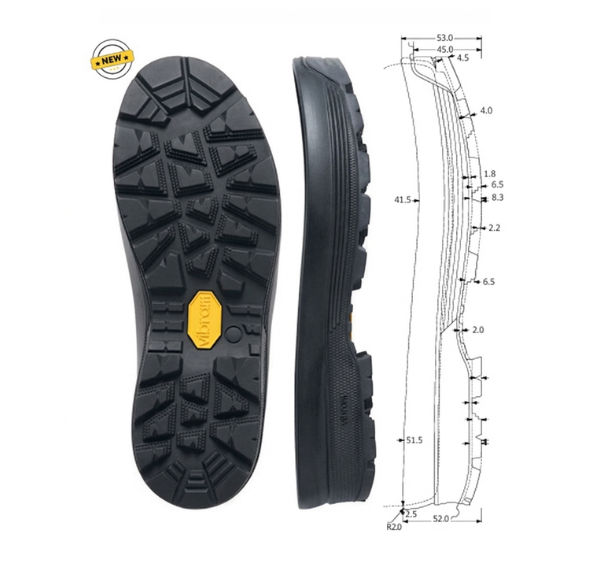 Suola scatolata ad alto profilo con tecnologia Vibram. Caratterizzata da un bordo protettivo perimetrale in gomma e intersuola in poliuretano ammortizzante, offre un’aderenza estrema su roccia e fango, rendendola ideale per scarponi da trekking pesante e alpinismo.