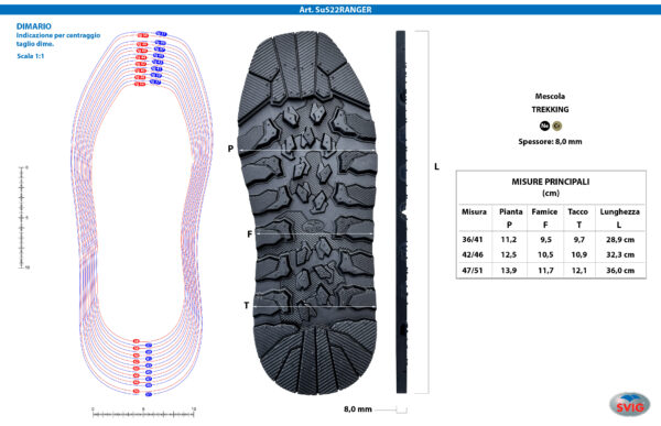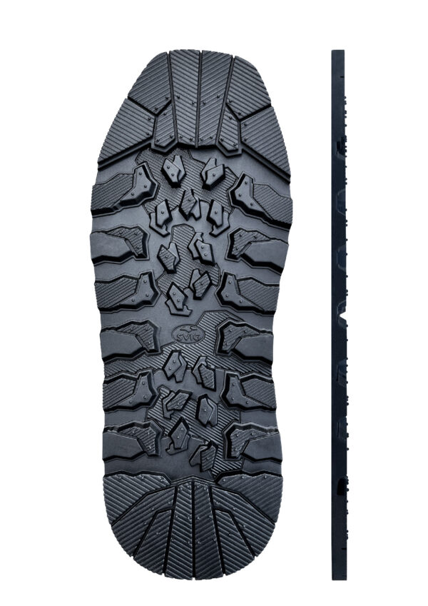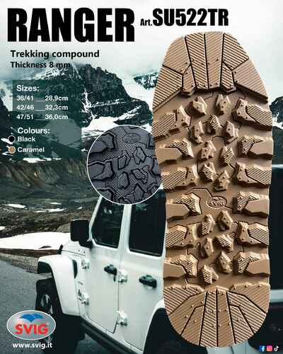 La suola 522 Ranger di SVIG è una suola piatta progettata per offrire il massimo grip e una durata superiore su ogni tipo di terreno. Grazie al suo design tecnico e audace, questa suola garantisce prestazioni eccellenti anche su superfici bagnate o irregolari, rendendola ideale per calzature da outdoor e trekking. Realizzata con mescole di alta qualità (spessore 8.0 mm), si distingue per la facilità di incollaggio con adesivi neoprenici, assicurando una tenuta sicura e professionale. Unisce estetica grintosa e funzionalità tecnica per affrontare le sfide più difficili