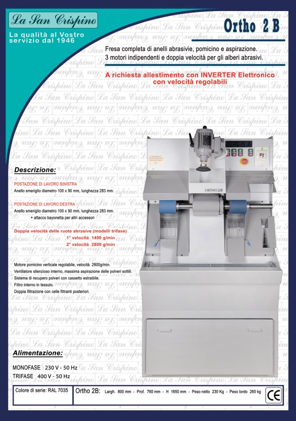 Nei modelli trifase è disponibile la doppia velocità delle ruote abrasive (1400 e 2800 g/min), integrata da un motore pomicino verticale regolabile. La salute dell’operatore è garantita da un avanzato sistema di aspirazione con ventilatore silenzioso, filtro interno in tessuto, doppia filtrazione posteriore e un pratico cassetto estraibile per il recupero delle polveri sottili.