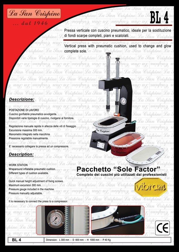 La BL 4 di La San Crispino è una pressa verticale dotata di cuscino pneumatico, progettata specificamente per la sostituzione di fondi scarpe completi, piani e scatolati. La postazione di lavoro si avvale di un cuscino gonfiabile pneumatico avvolgente, disponibile in varie tipologie a seconda delle esigenze. La macchina permette una regolazione manuale rapida dell’altezza tramite viti di fissaggio, con un’escursione massima di 300 mm. È dotata di un manometro integrato per il controllo della pressione, che è regolabile manualmente. Per il funzionamento, la pressa necessita del collegamento a un compressore esterno. Il pacchetto “Sole Factor” include i cuscini più utilizzati dai professionisti.