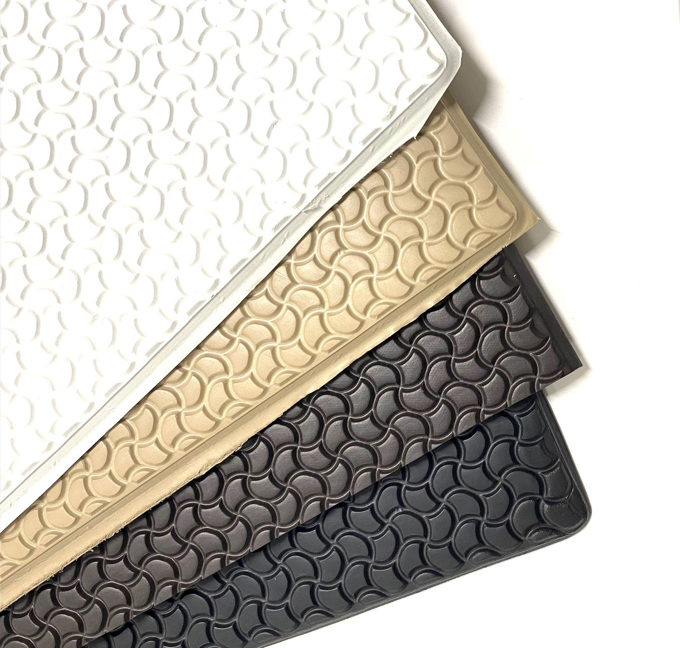 Lastra in gomma espansa Urban da 10 mm con design multidirezionale, specifica per riparazioni stile Birkenstock, calzature sportive e ortopediche. Leggera, elastica e con elevate proprietà di assorbimento degli urti. Disponibile  nei colori nero, marrone scuro, beige e bianco. Dimensioni: 110×57