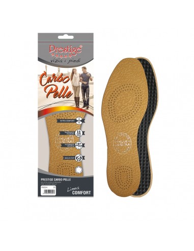 La soletta Prestige Carbo Pelle è la soluzione ideale per chi desidera il massimo dell’igiene senza rinunciare alla qualità della vera pelle. Lo strato superiore è realizzato in pelle di prima scelta, che assicura una naturale traspirabilità e una piacevole sensazione di freschezza al contatto con il piede. La vera innovazione risiede nello strato inferiore in schiuma di lattice ai carboni attivi, che agisce efficacemente neutralizzando i cattivi odori e assorbendo l’umidità in eccesso. Grazie a questa combinazione, la soletta garantisce un microclima asciutto e una morbida ammortizzazione, rendendola perfetta per calzature eleganti e quotidiane dove il benessere e la pulizia sono prioritari.
